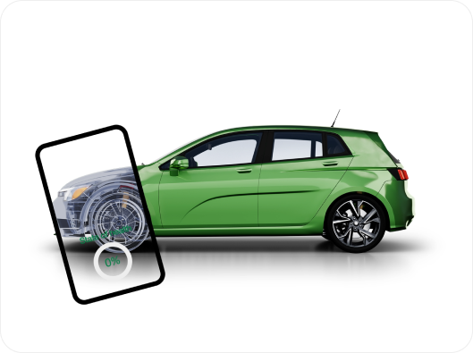 Grön halvkombi som skannas av en handhållen enhet, där bilens inre konstruktion visas genom karossen, batteritest för MRF-handlare.